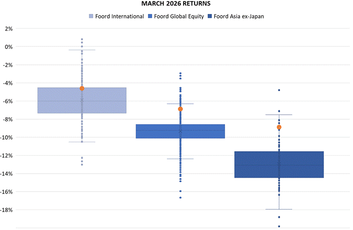The following box-and-whisker chart shows the range of returns for the peer group sectors of key investment strategies for the month of March 2026. Each box contains the middle 50% of fund returns, while each whisker encloses the top and bottom quartiles. Outliers are shown as single dots, with the Foord funds shown as orange circles. Every Foord fund shown outperformed at least 75% of other funds with similar investment strategies.